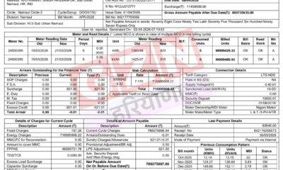 हरियाणा3 weeks agoनारनौल में 78 करोड़ का बिजली बिल : 8 दिन में 80 करोड़ पार होने की चेतावनी , विभाग ने मानी गड़बड़ी, जांच शुरू